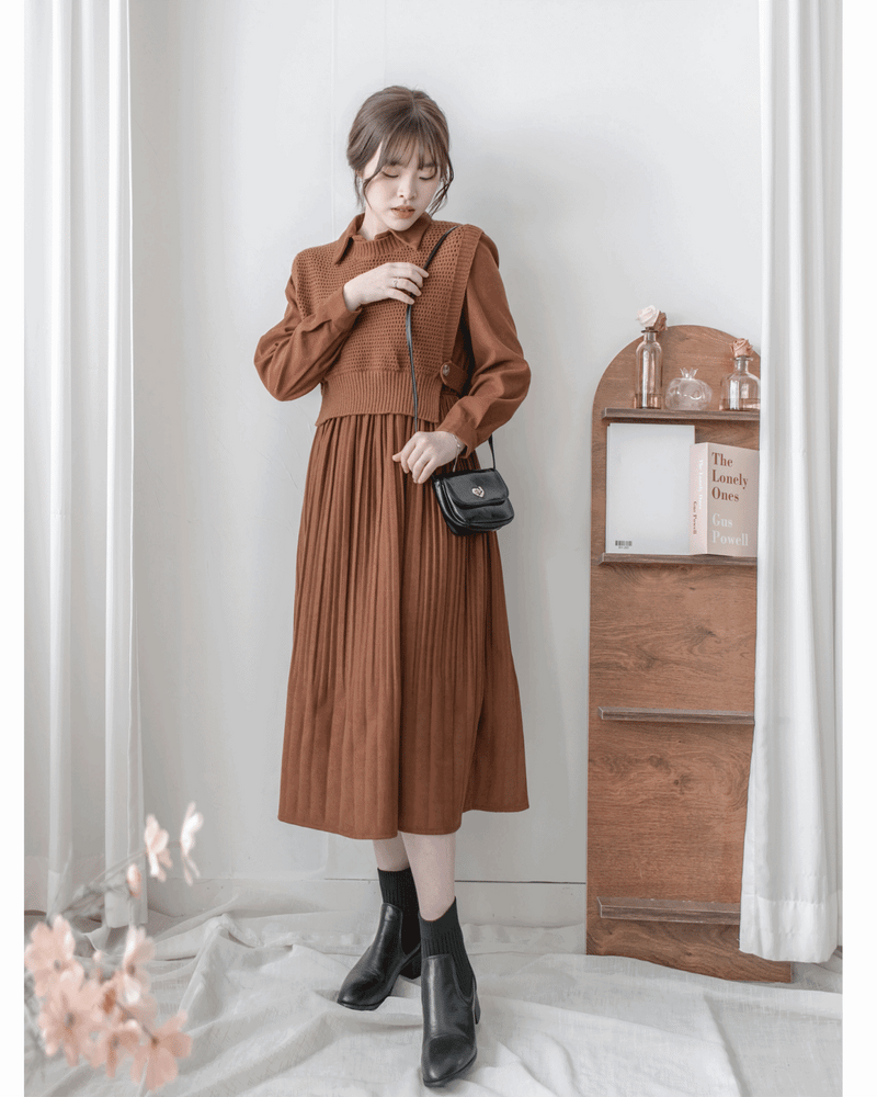 Korea Brown Set 同色系針織背心百褶裙套裝(配送腰帶)/ DS1052
