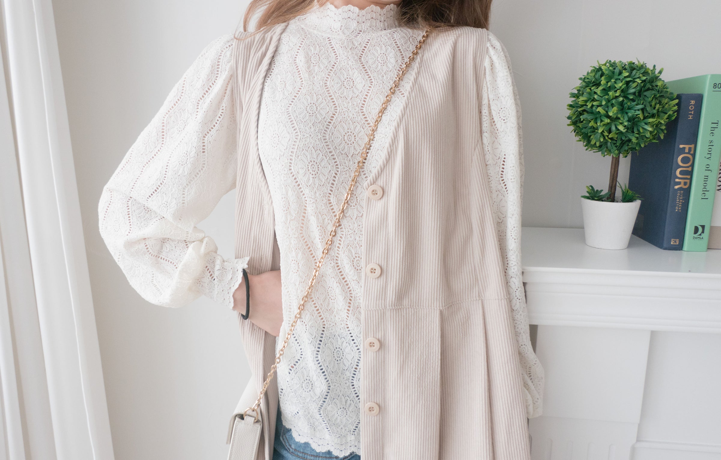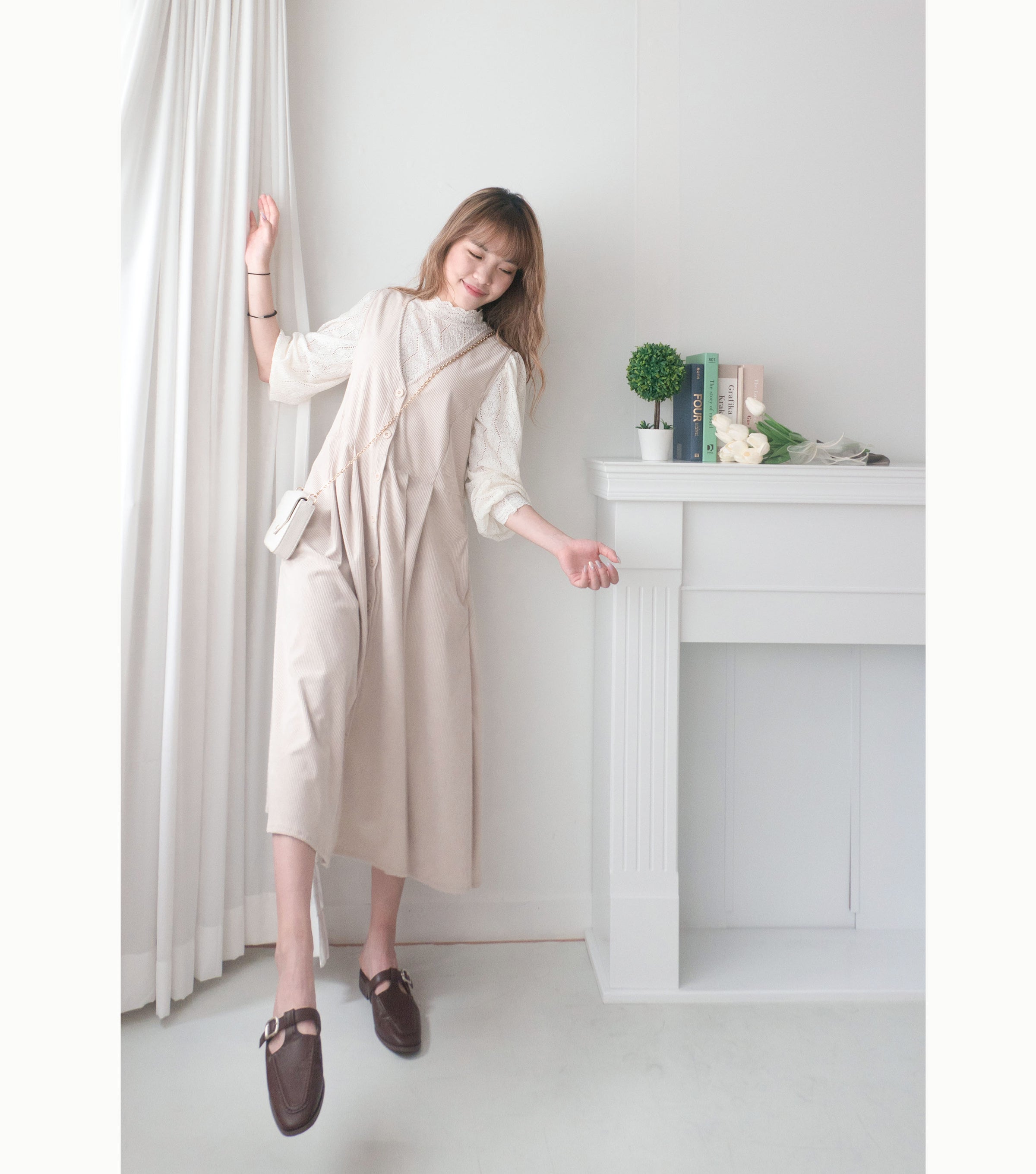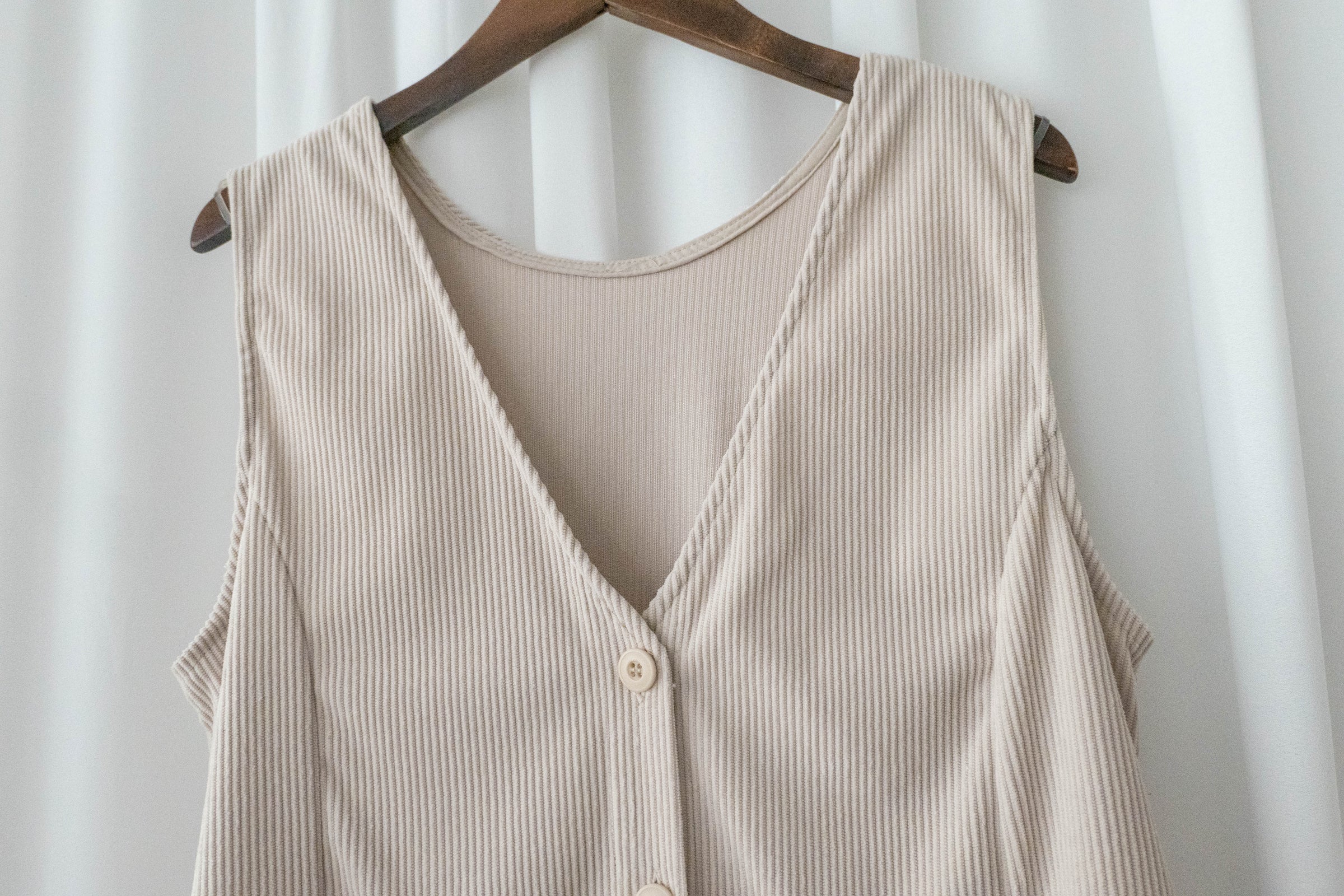 【intent X Korea label】 Beige Vest 淺杏暗紋微絨口袋腰間大百褶, Dress/ DS9369