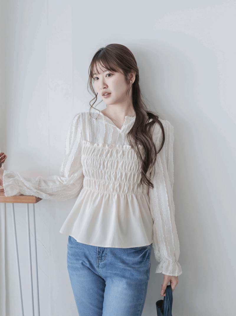 Korea [限量現貨回歸] Feather Daisy, Blouse 羽毛花花前橡筋裙擺上衣 /BU9091