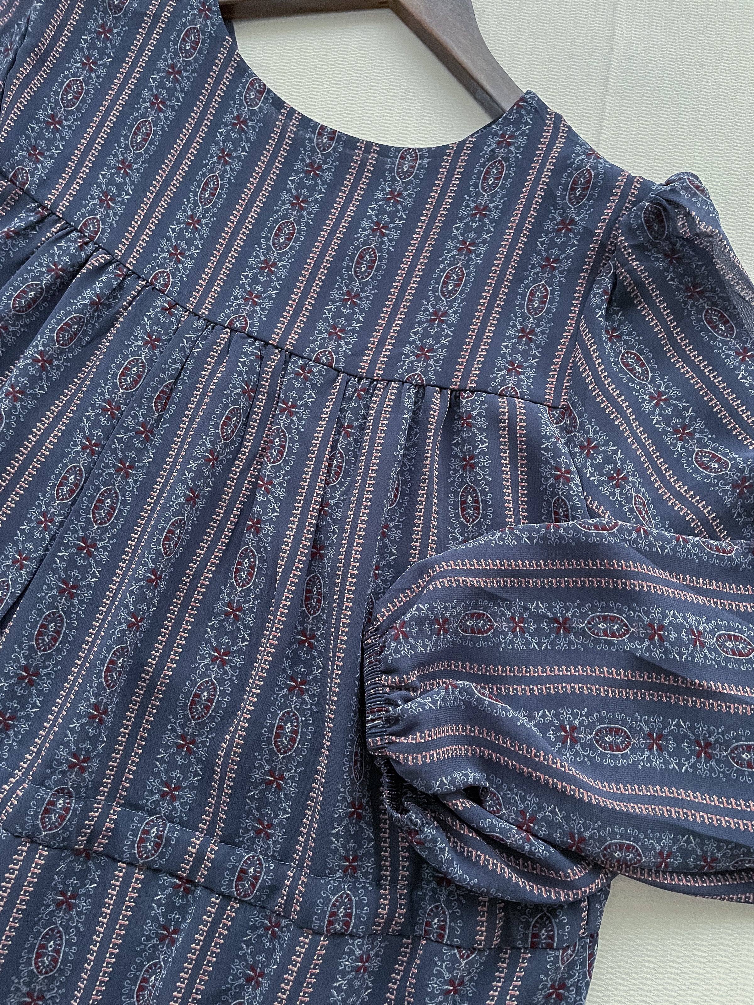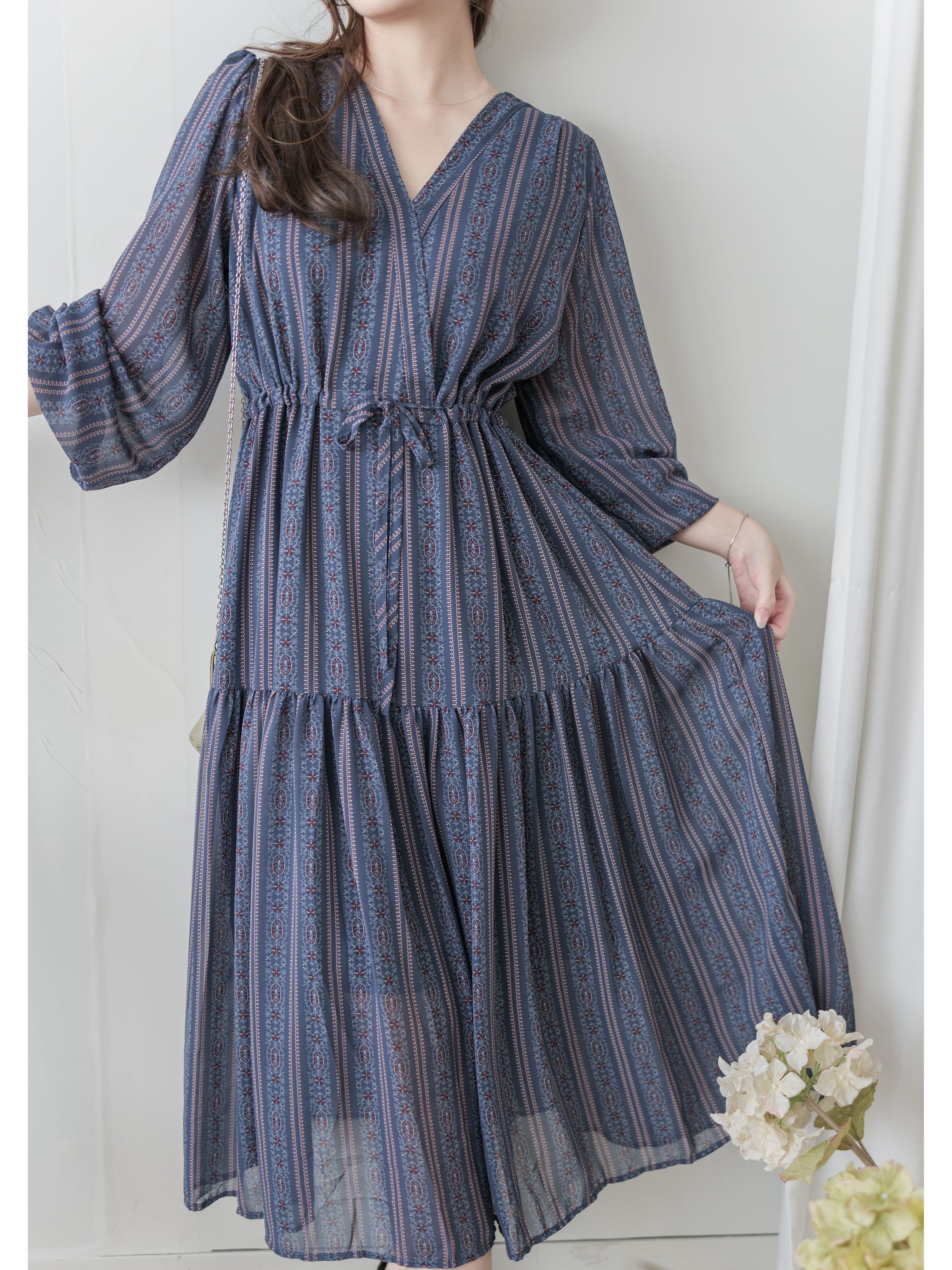 Misty Blue Chiffon Dress 霧藍民族印花束腰飄逸裙擺連身裙/ DS9989 (pre-order 10月9截單)