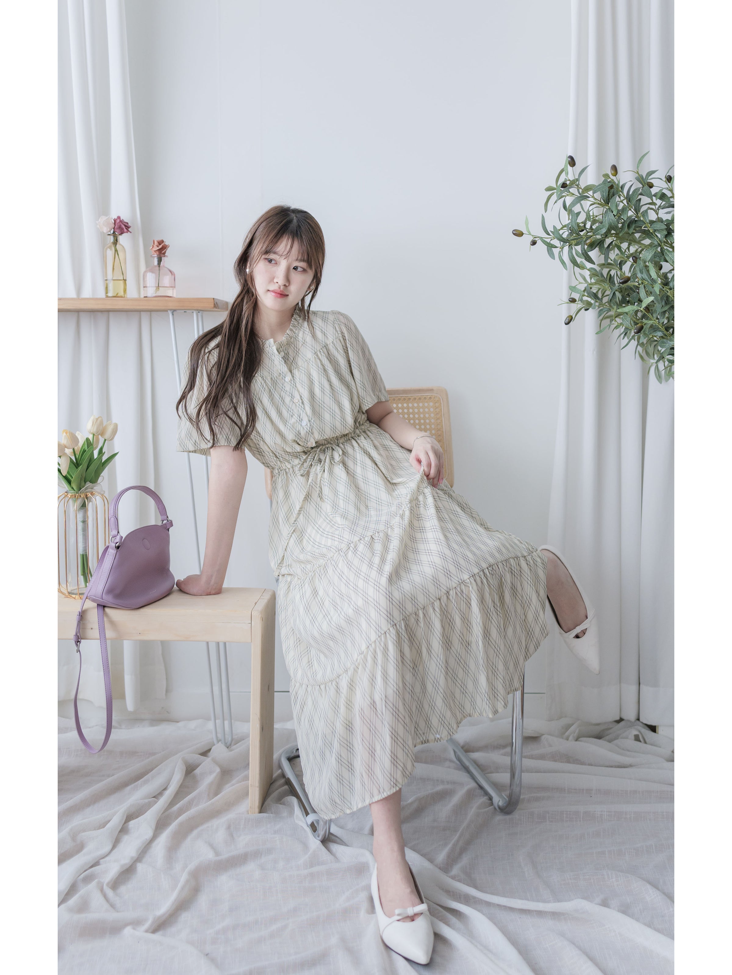 ✦花邊領口/束腰顯腰型 /飄逸裙擺/上身鈕扣/全裡布/菱格紋