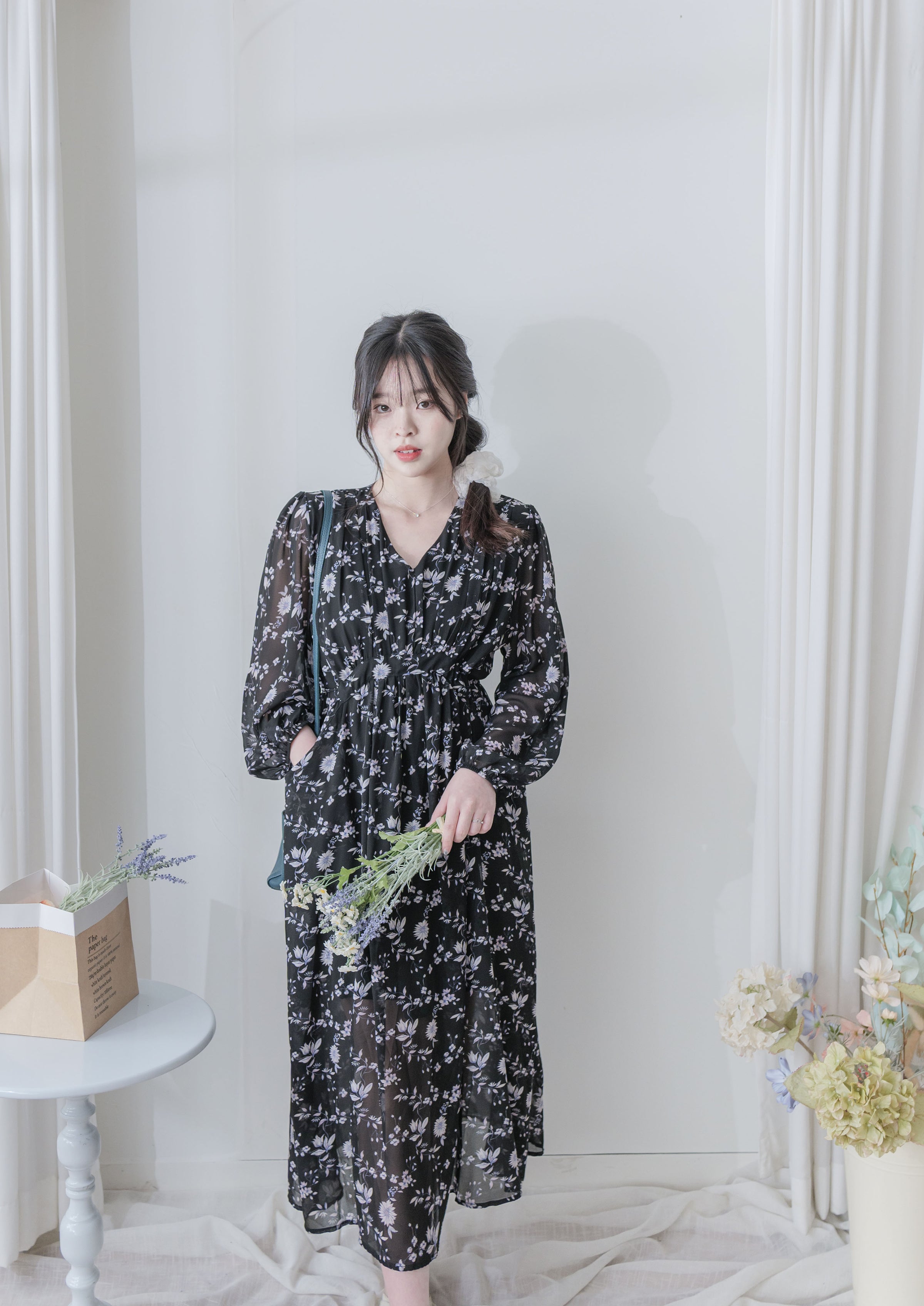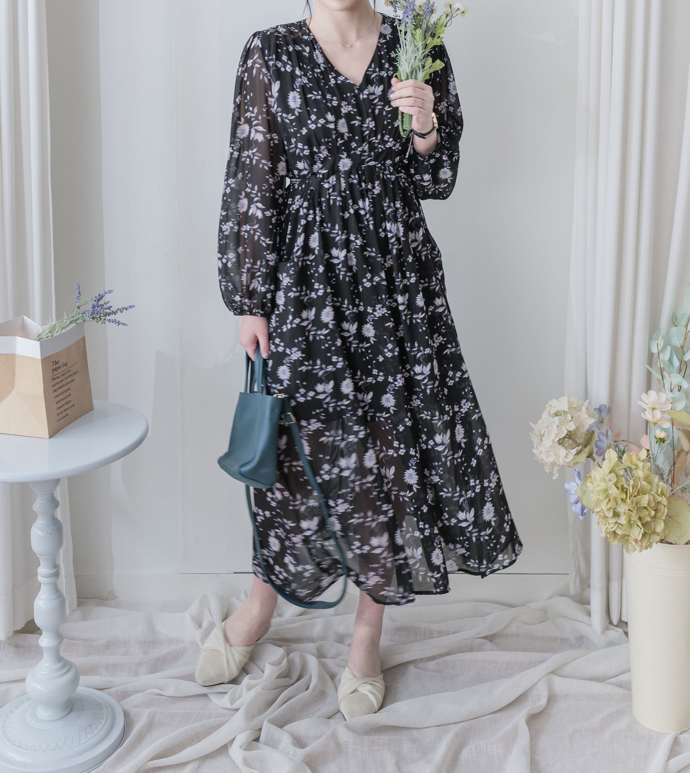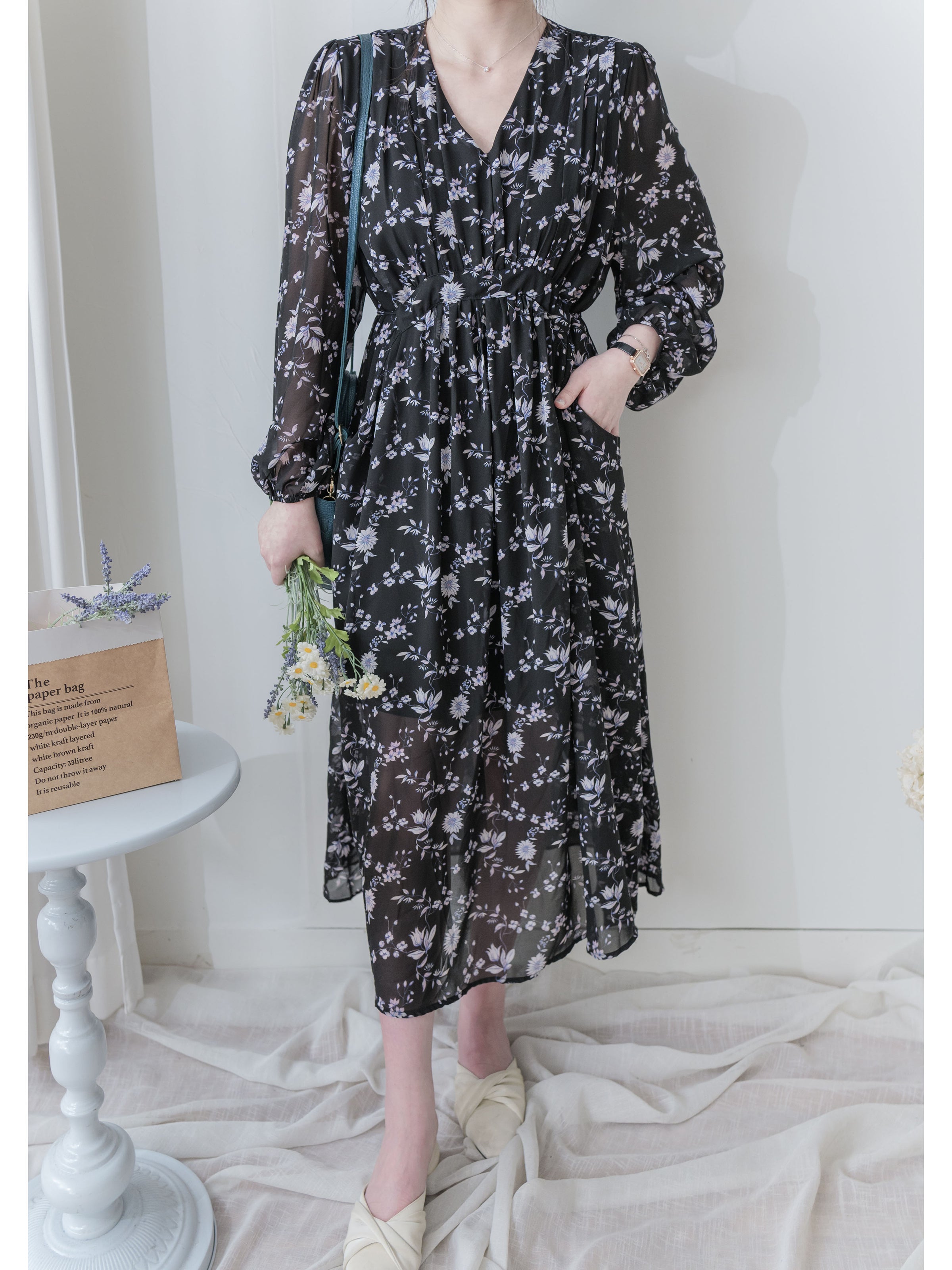 Lavender Daisy Dress 紫藍線條花顯腿長弧腰身口袋連身裙/ DS9997 (pre-order 10月9截單)
