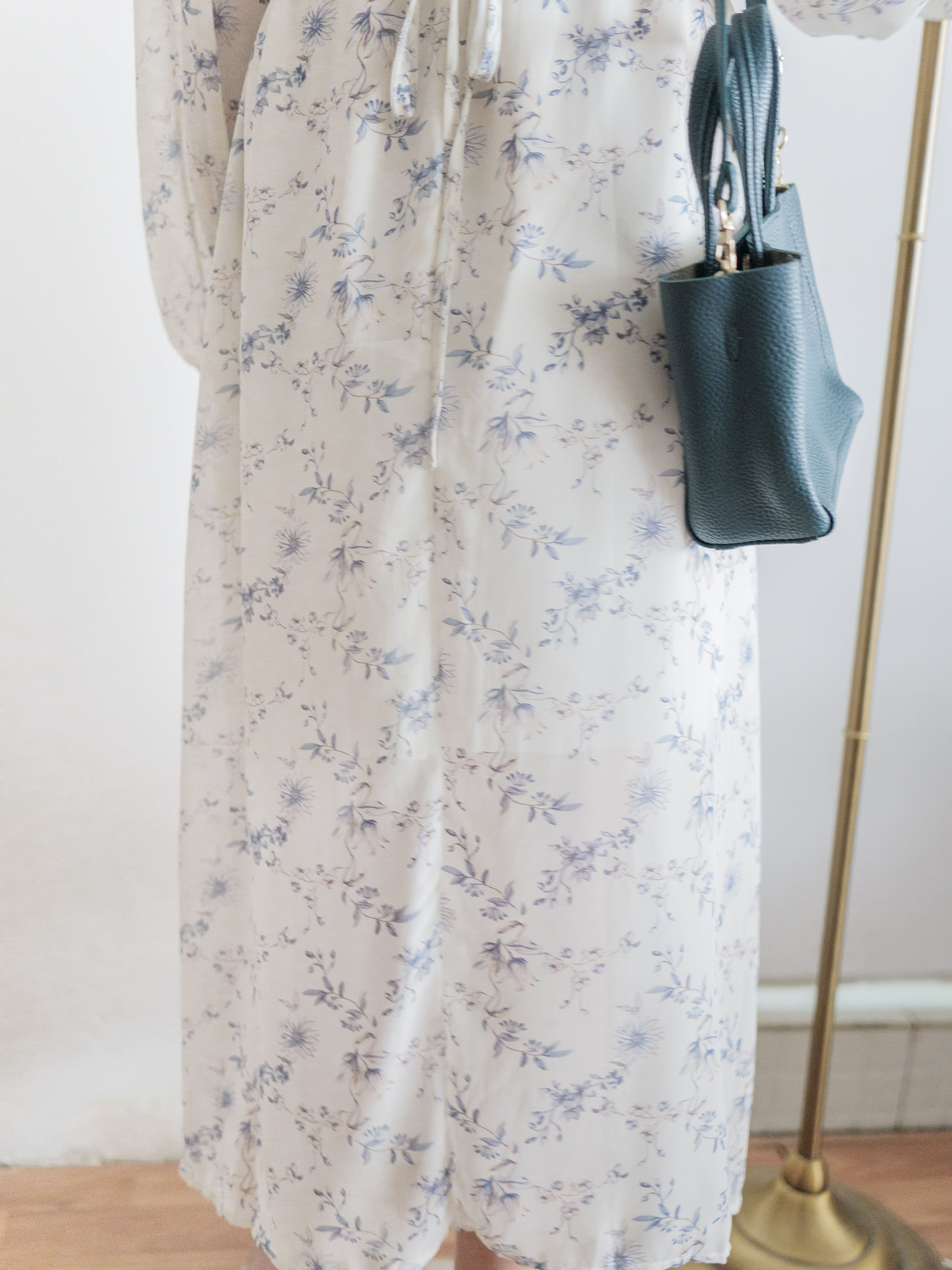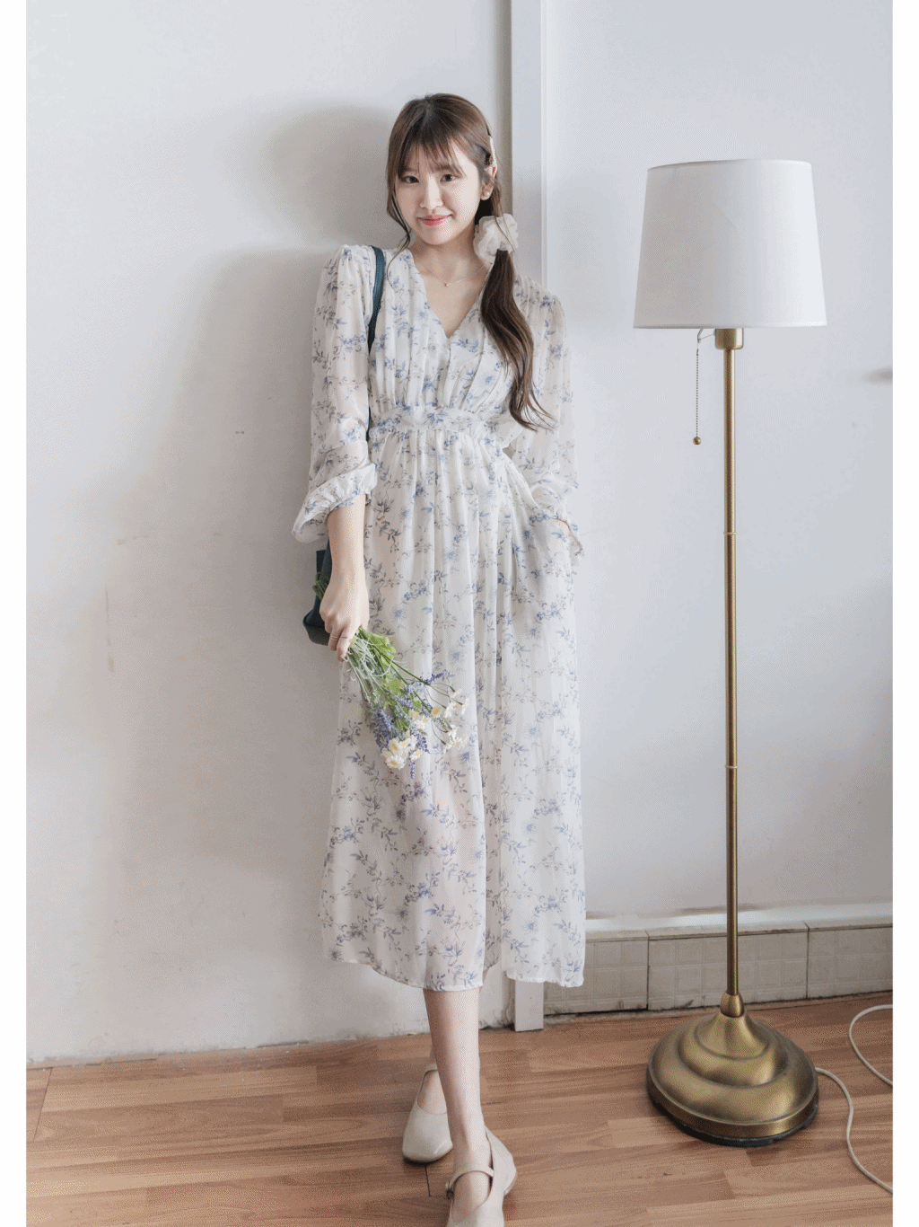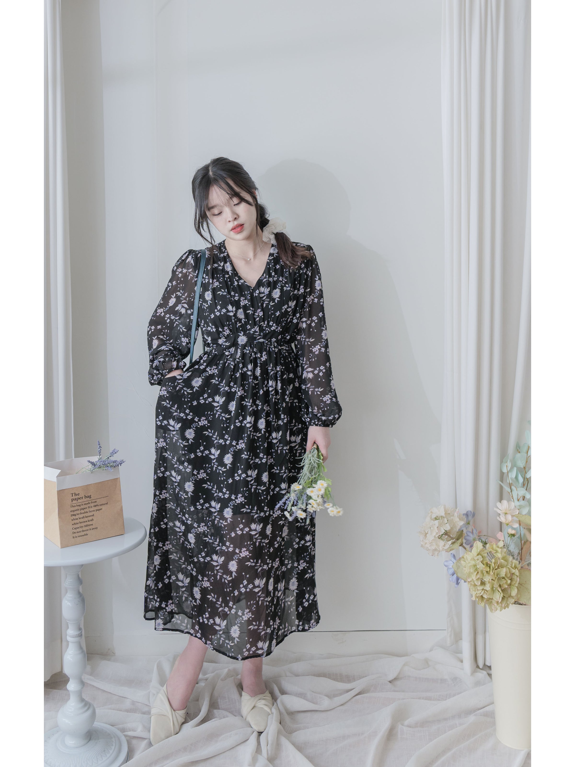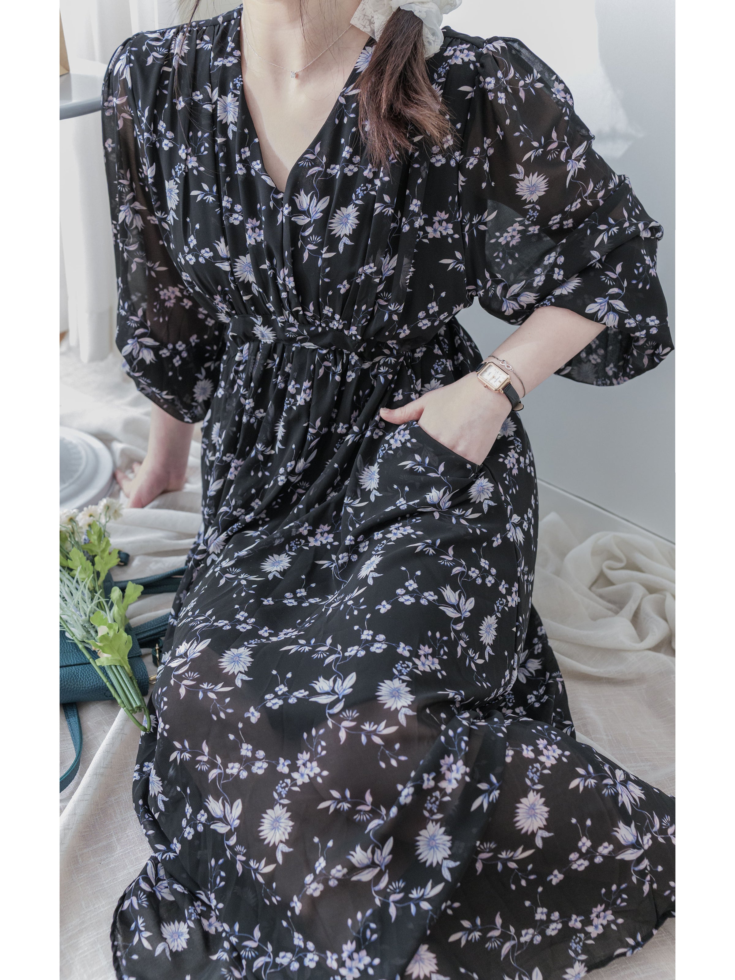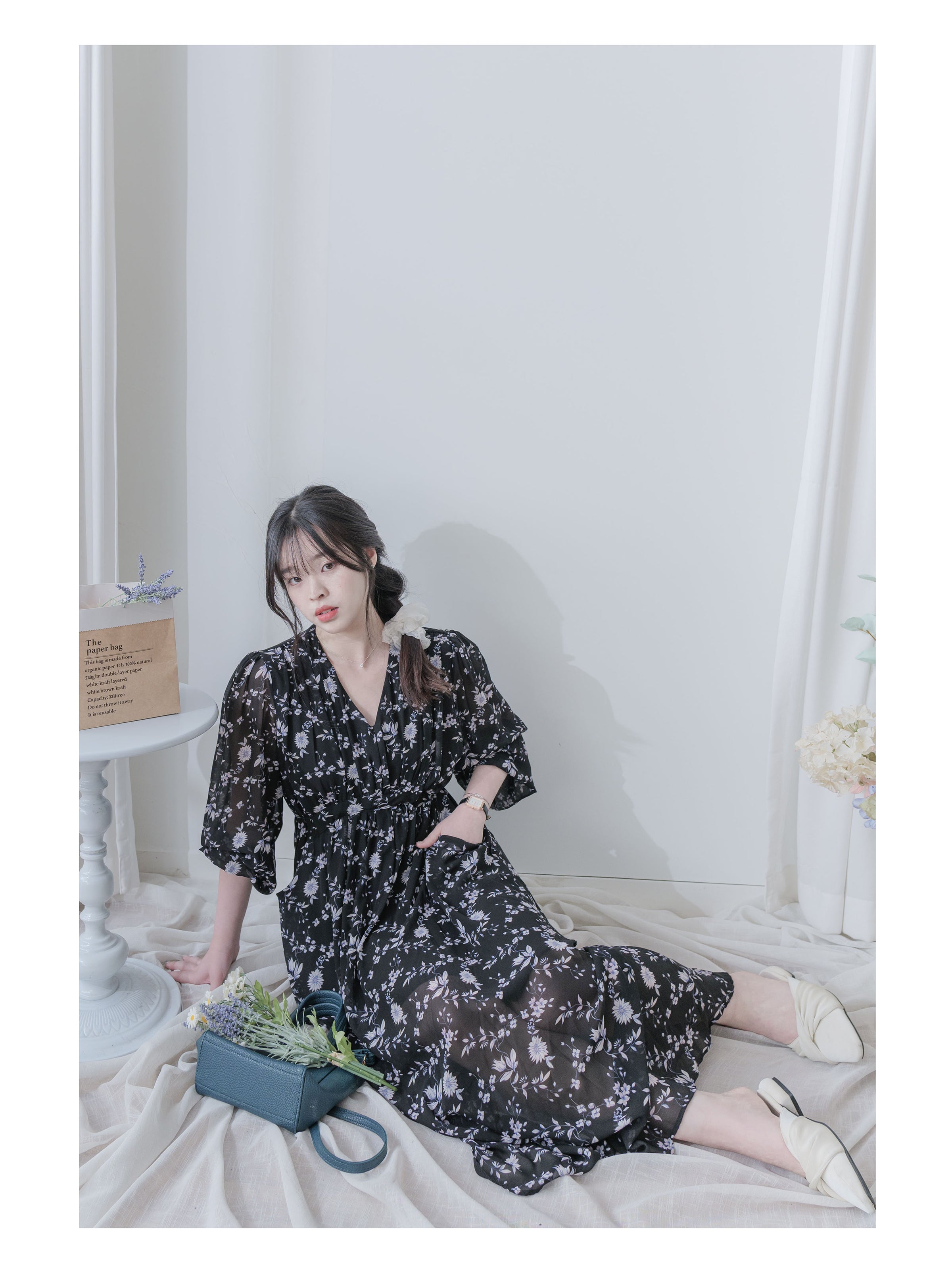 ✦顯鎖骨V領/弧腰身綁帶(高腰,顯腿長)/寬鬆橡筋頭手袖/飄逸裙擺/