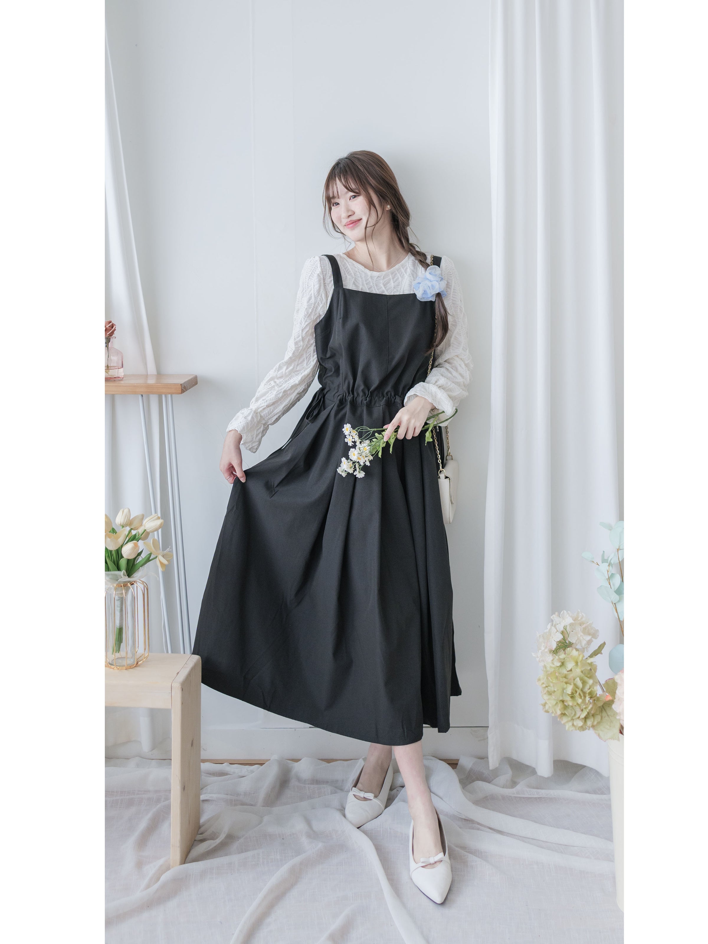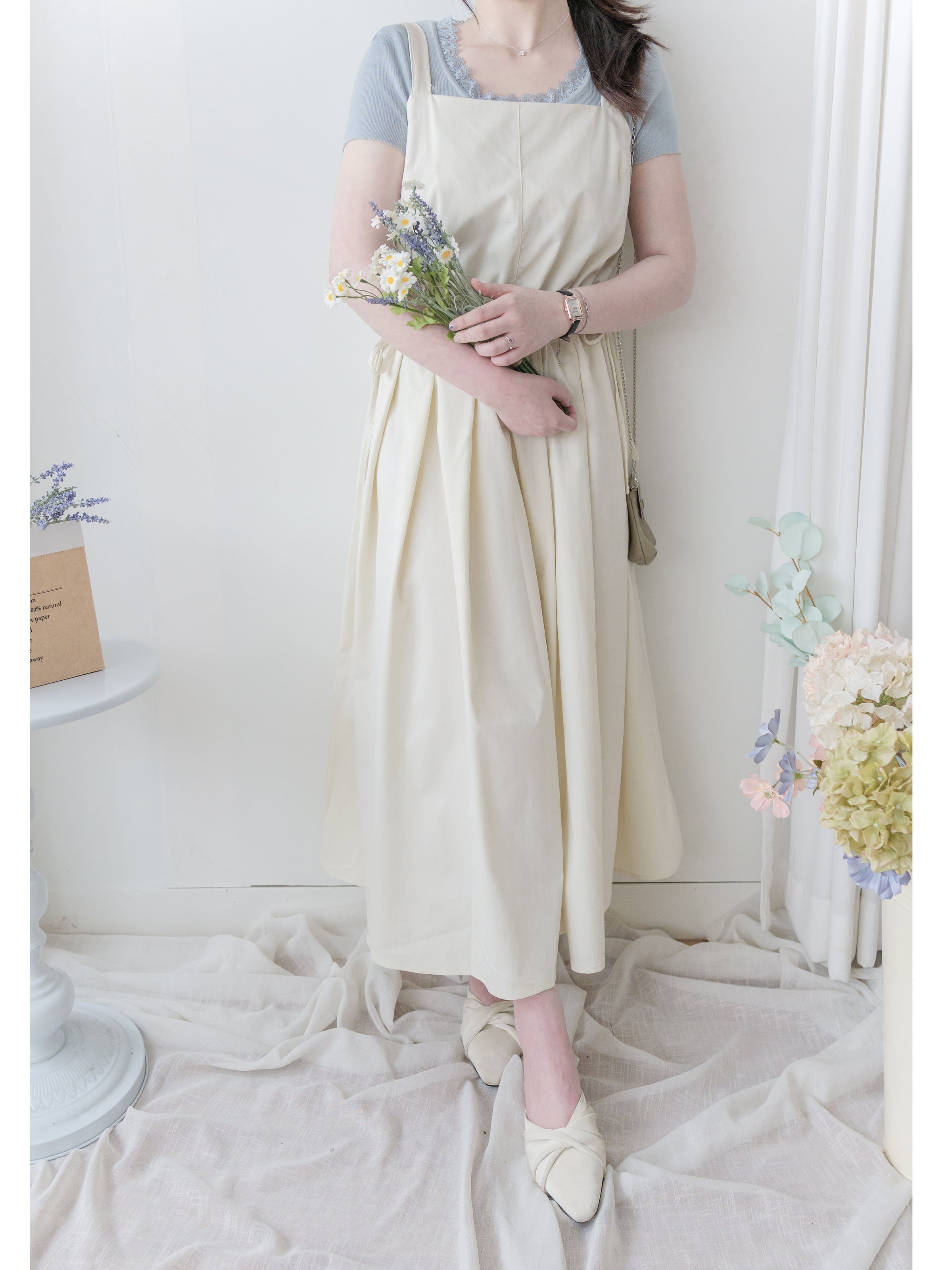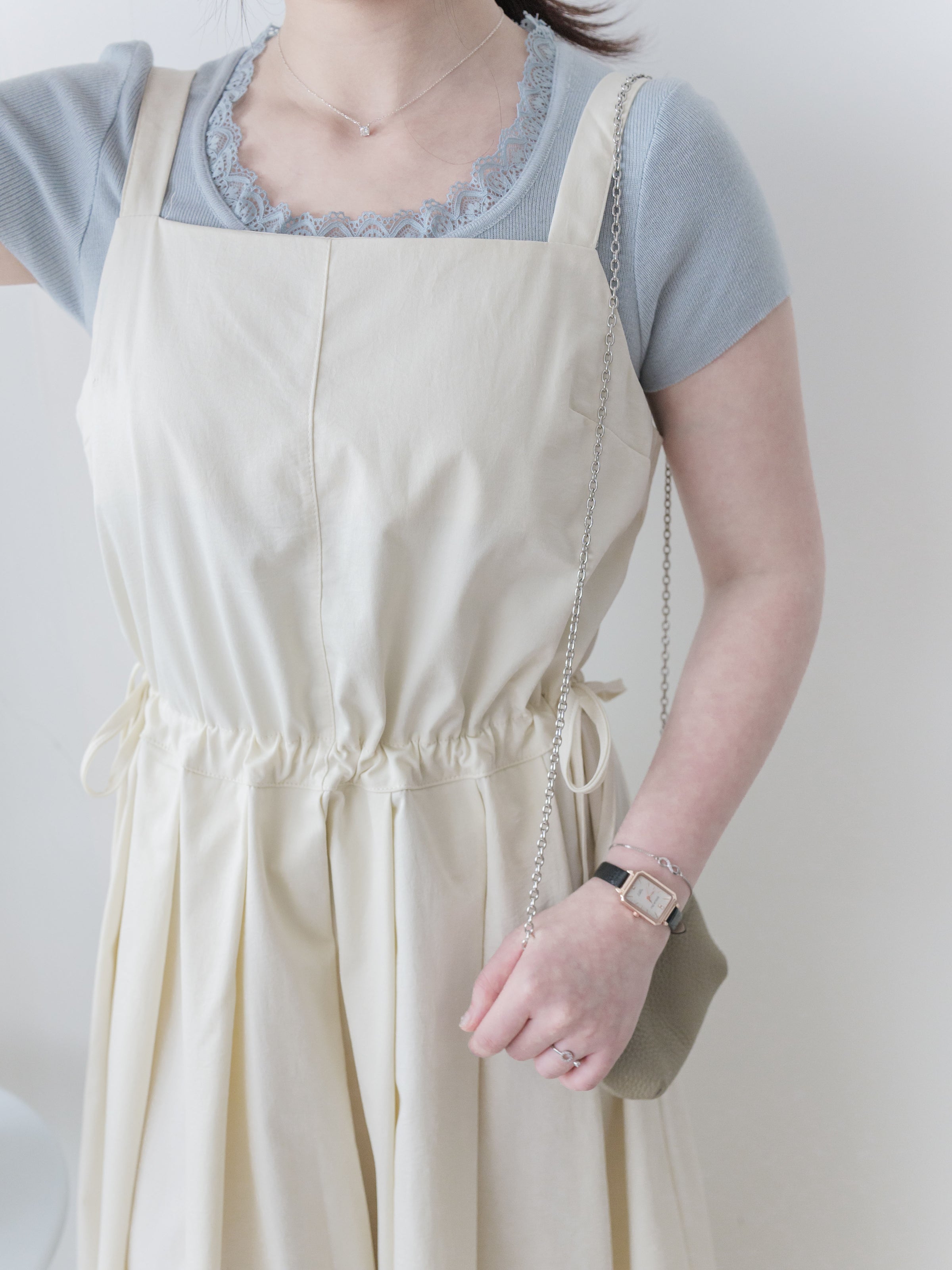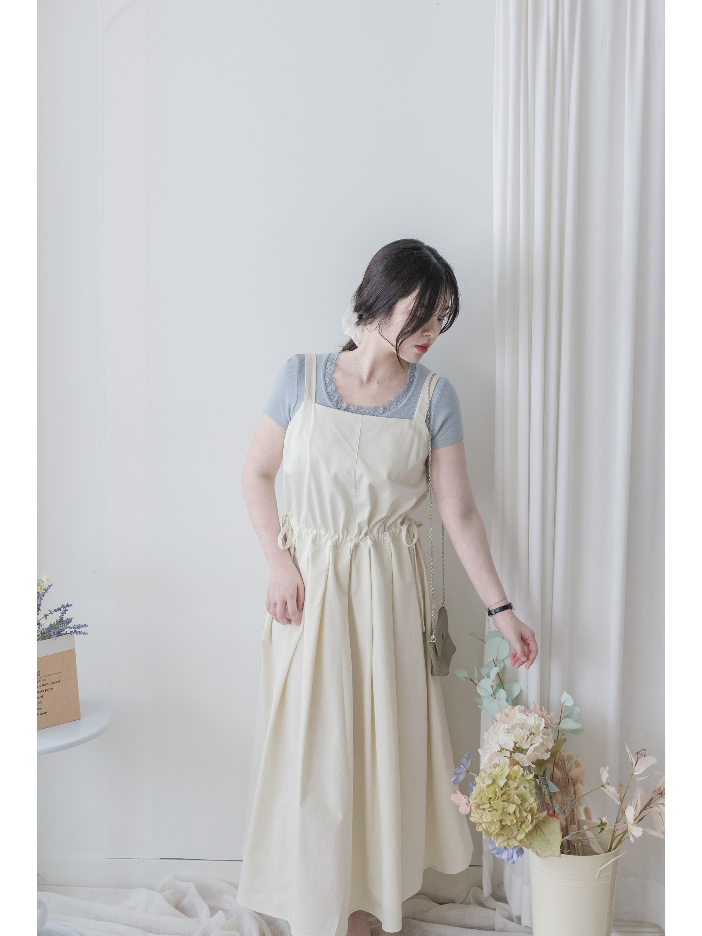 ✦平口吊帶/側綁繩束腰,顯腰型/腰下車褶款式,可修飾小腹