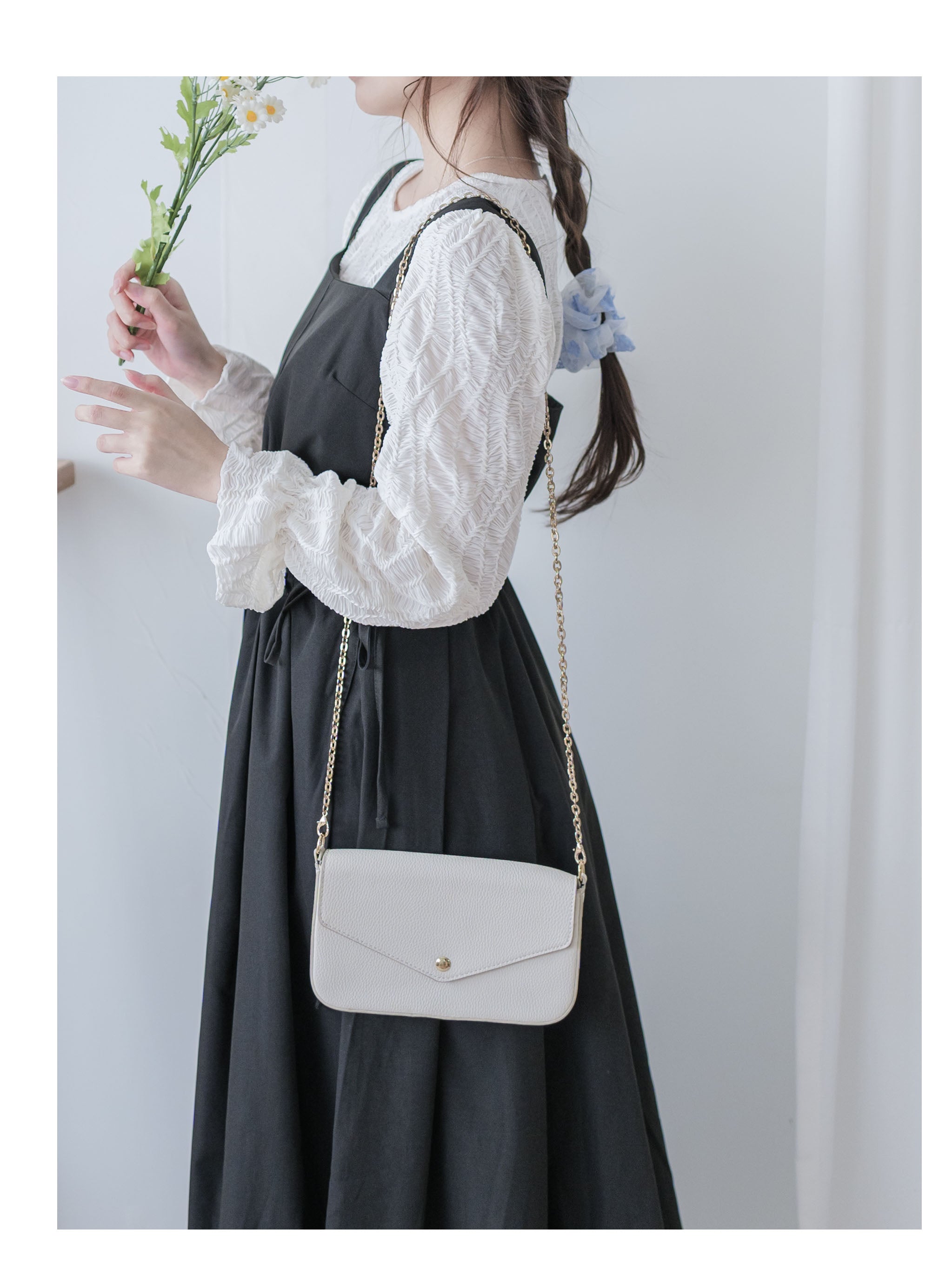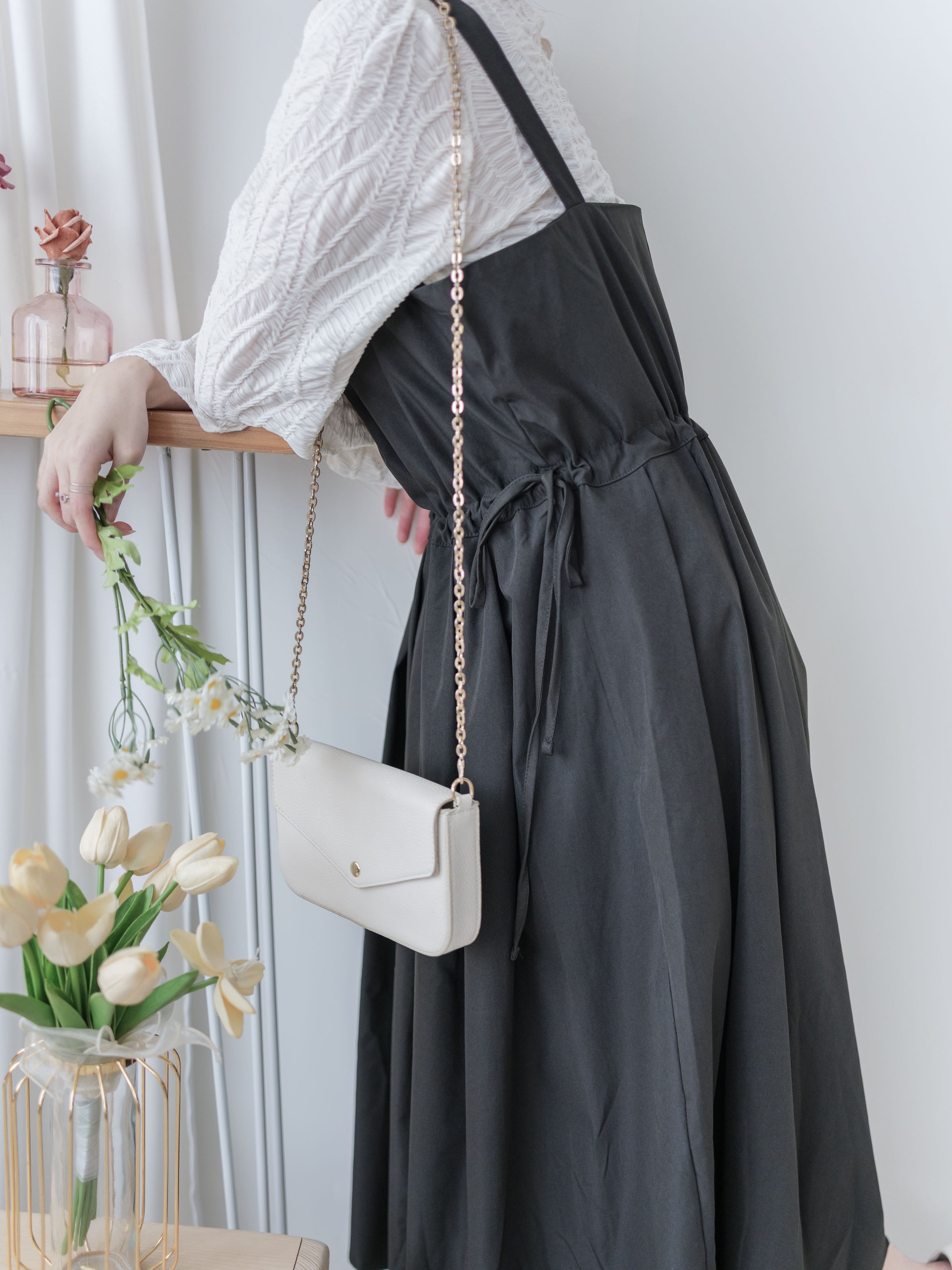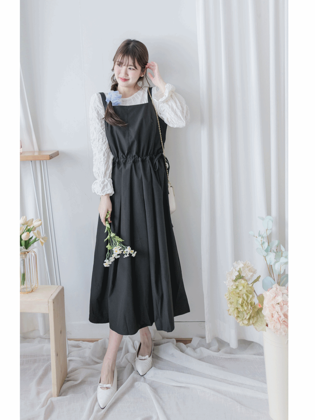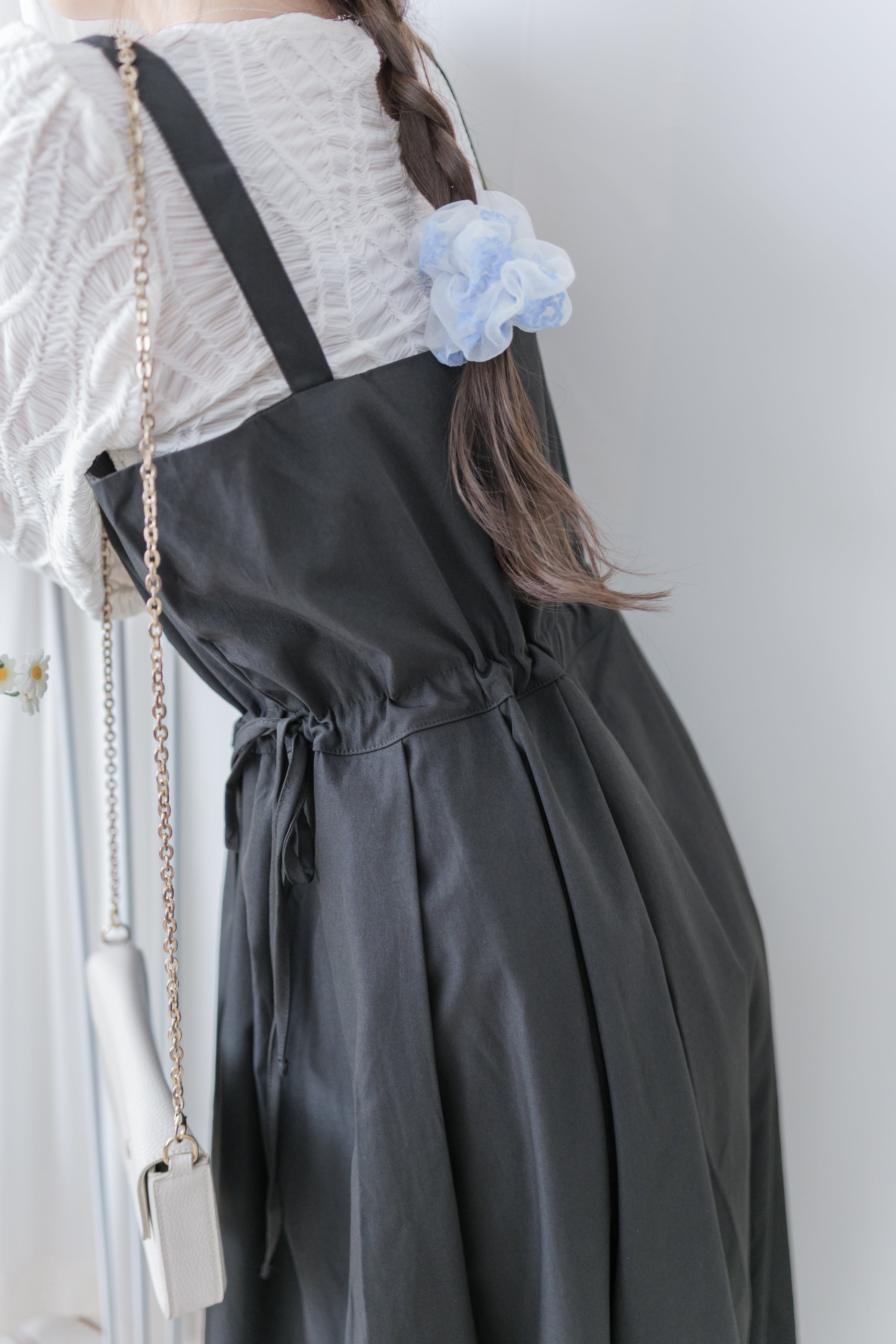 ✦平口吊帶/側綁繩束腰,顯腰型/腰下車褶款式,可修飾小腹
