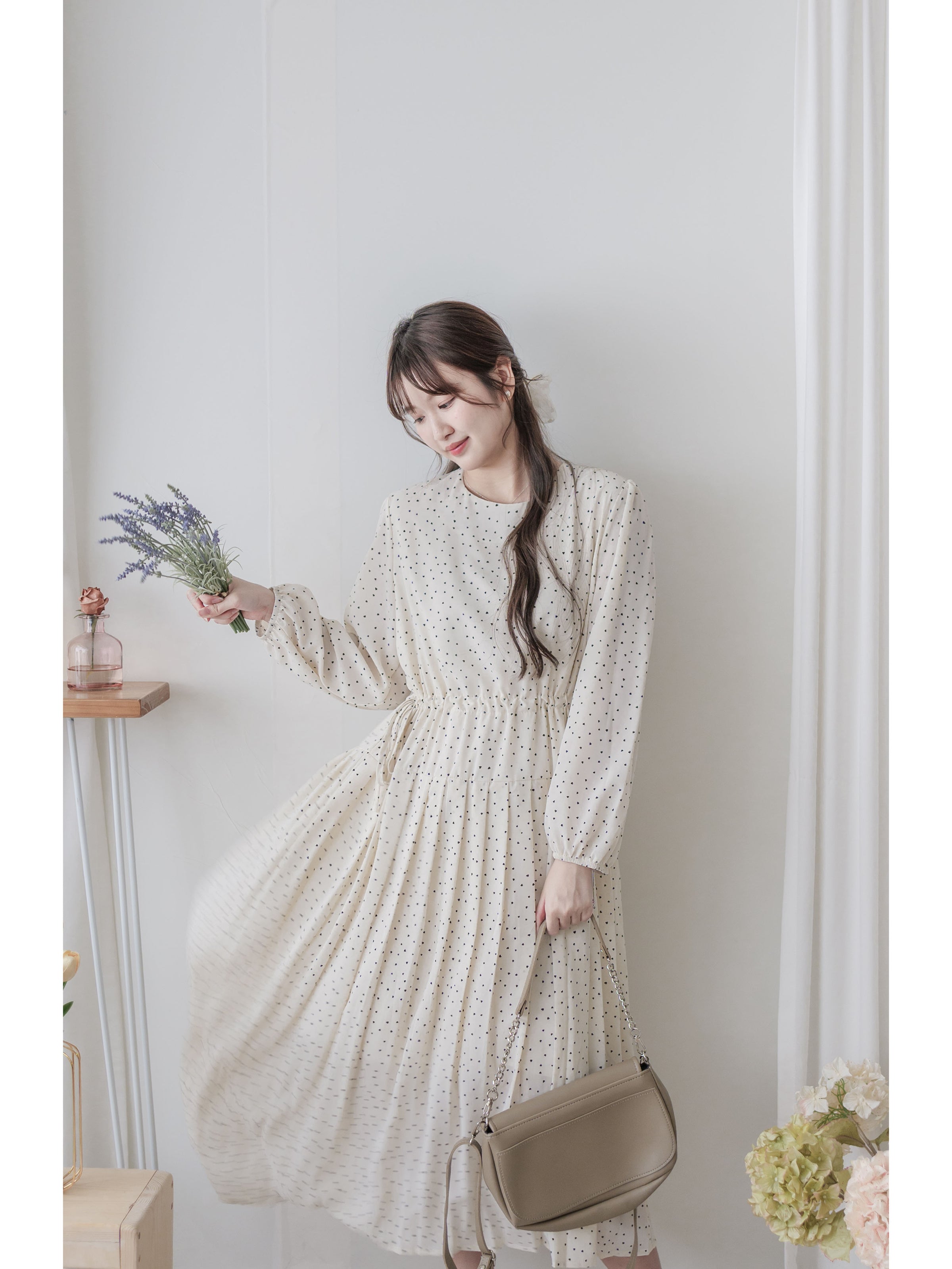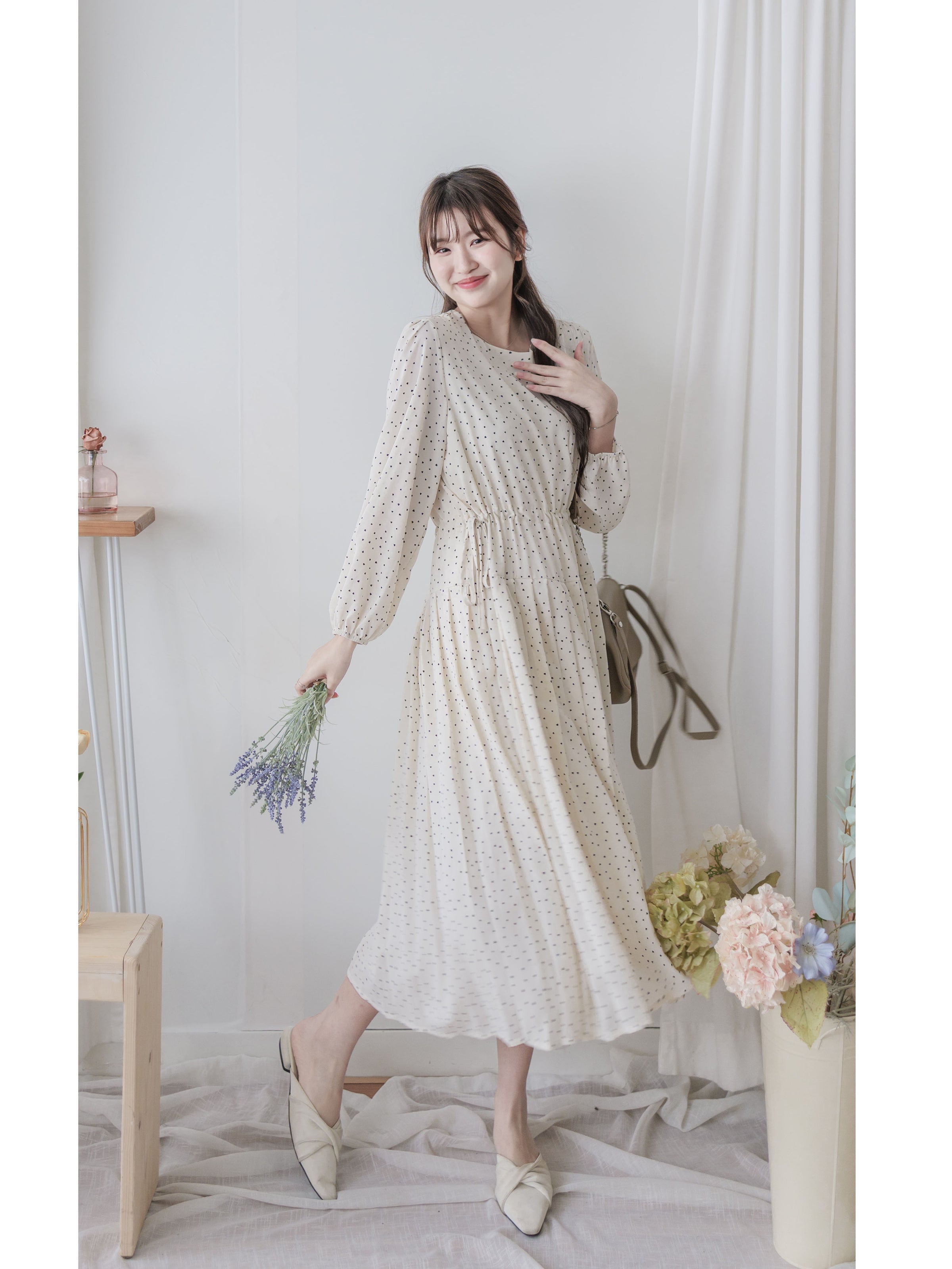 ✦側綁繩束腰,顯腰型/寬鬆橡筋頭手袖/高溫壓褶百褶裙身/後領口有鈕扣/