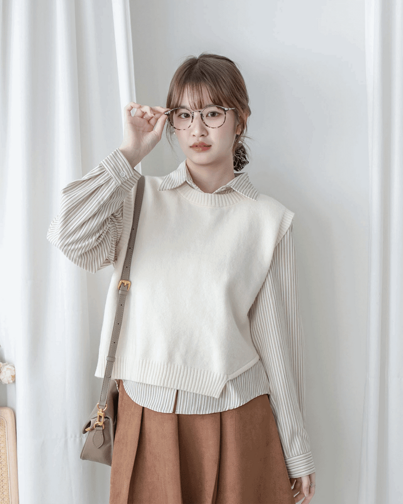 Korea Stripe Shirt Set 不規則下擺針織背心條紋襯衫套裝/ SE9087