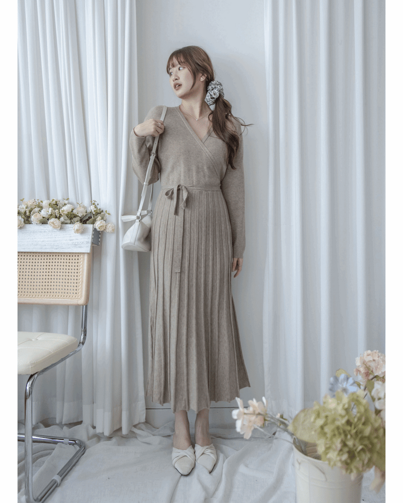 Korea Wrap Dress 疊V領立體線條針織裙擺彈性連身裙/ DS1049