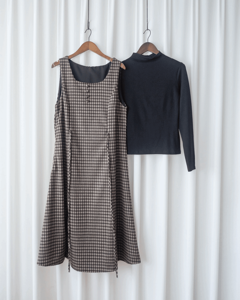 Korea Check Set 格紋方領綁帶修腰連身裙套裝 / SE8100