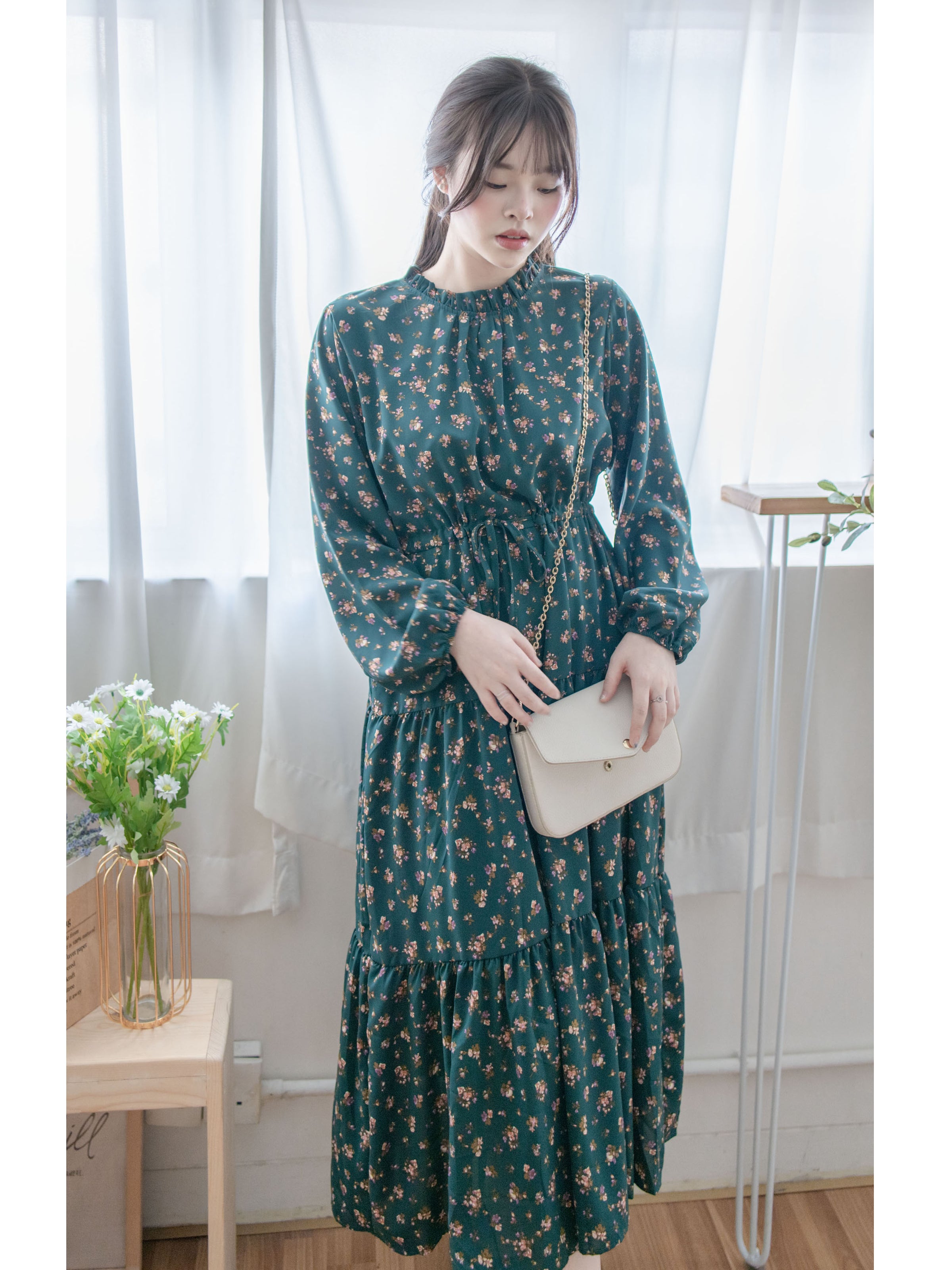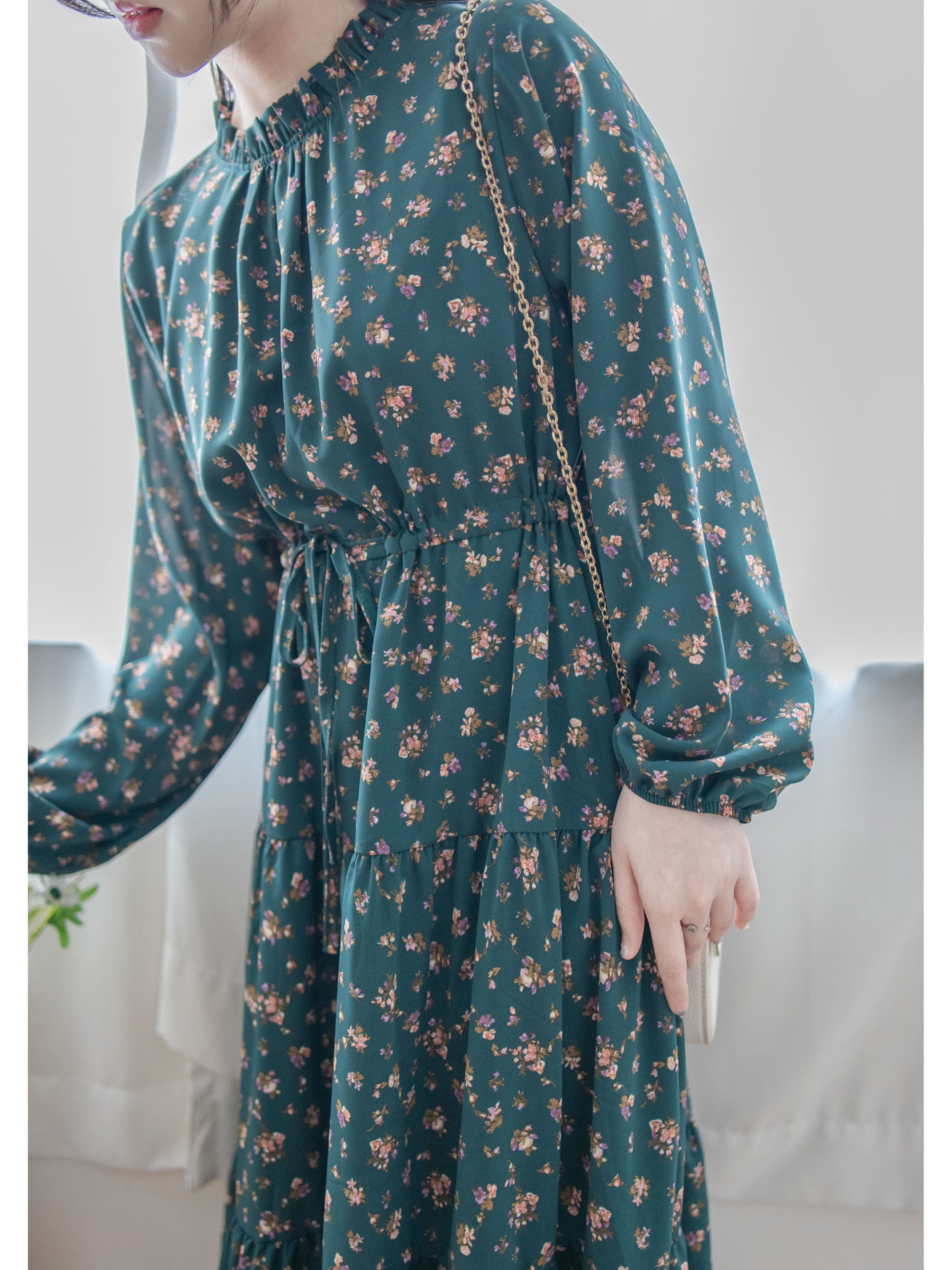 Lace Collar Floral Dress 細花邊圓領修腰印花連身裙/ DS1010