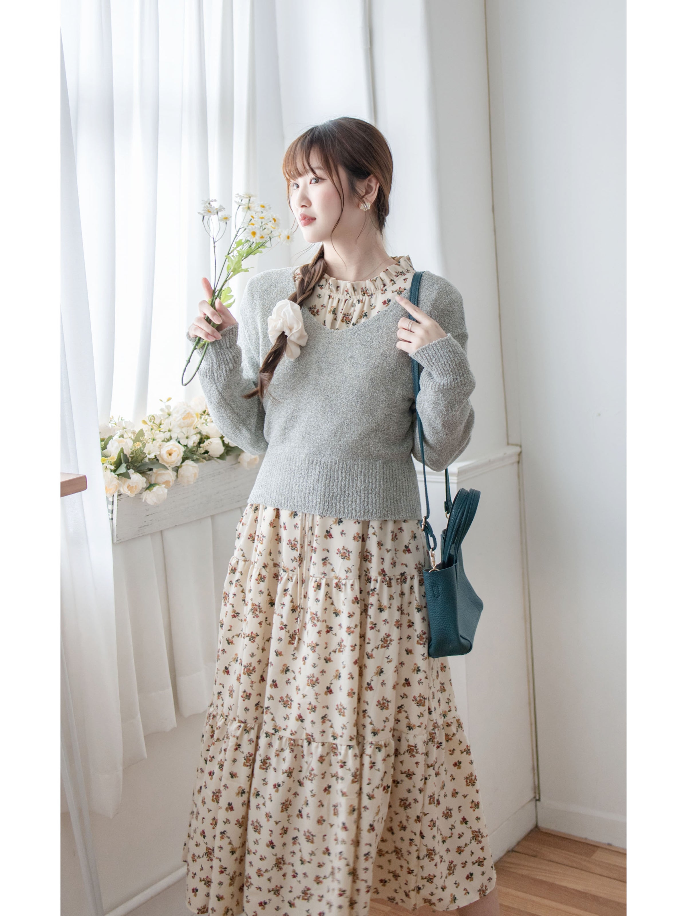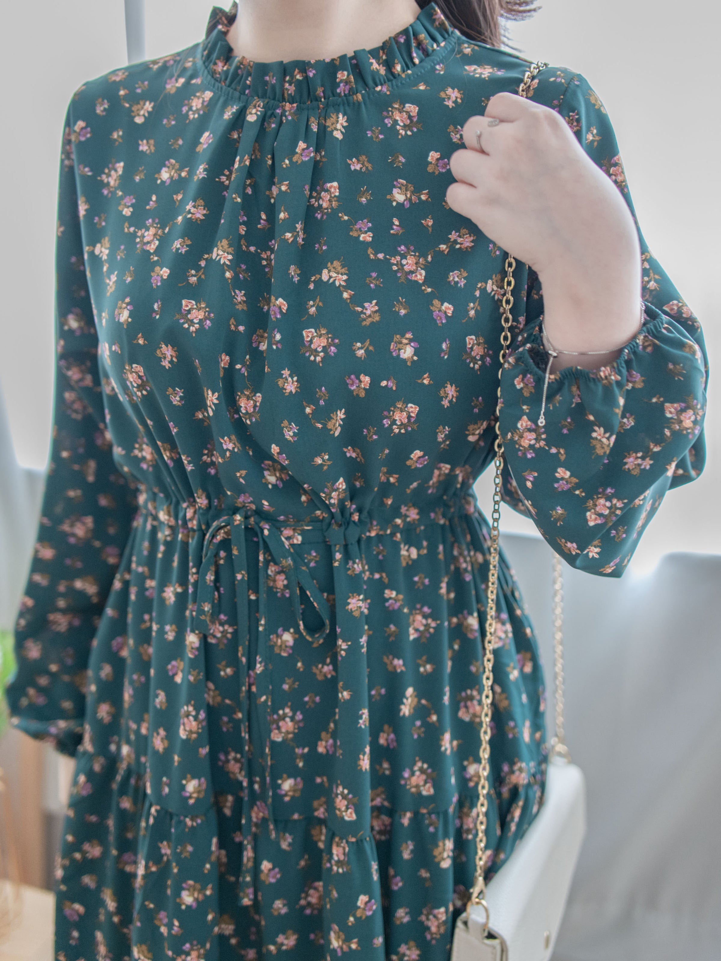 花束圖案/ 抽繩收腰設計/ 不影響臉形的花邊圓領/