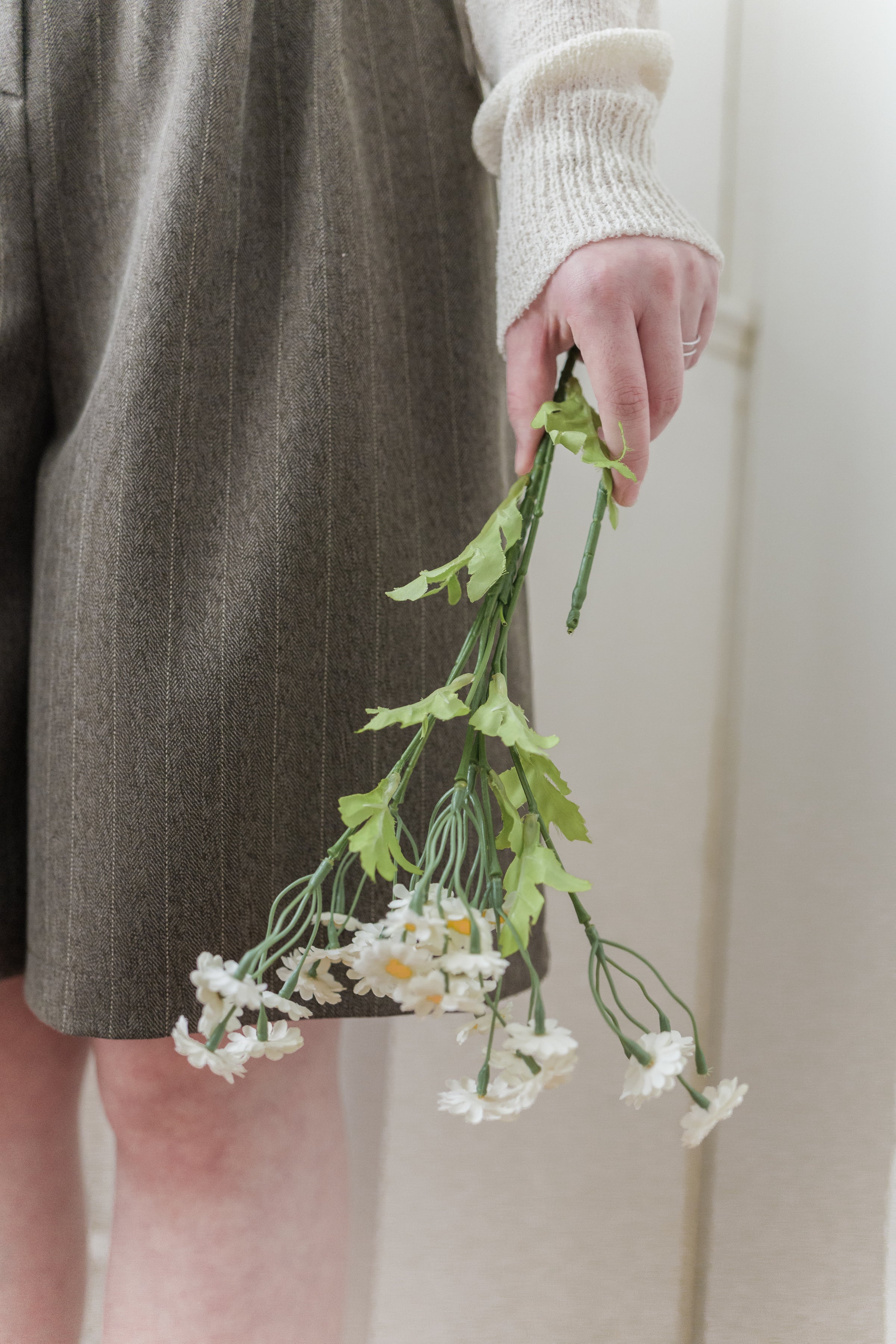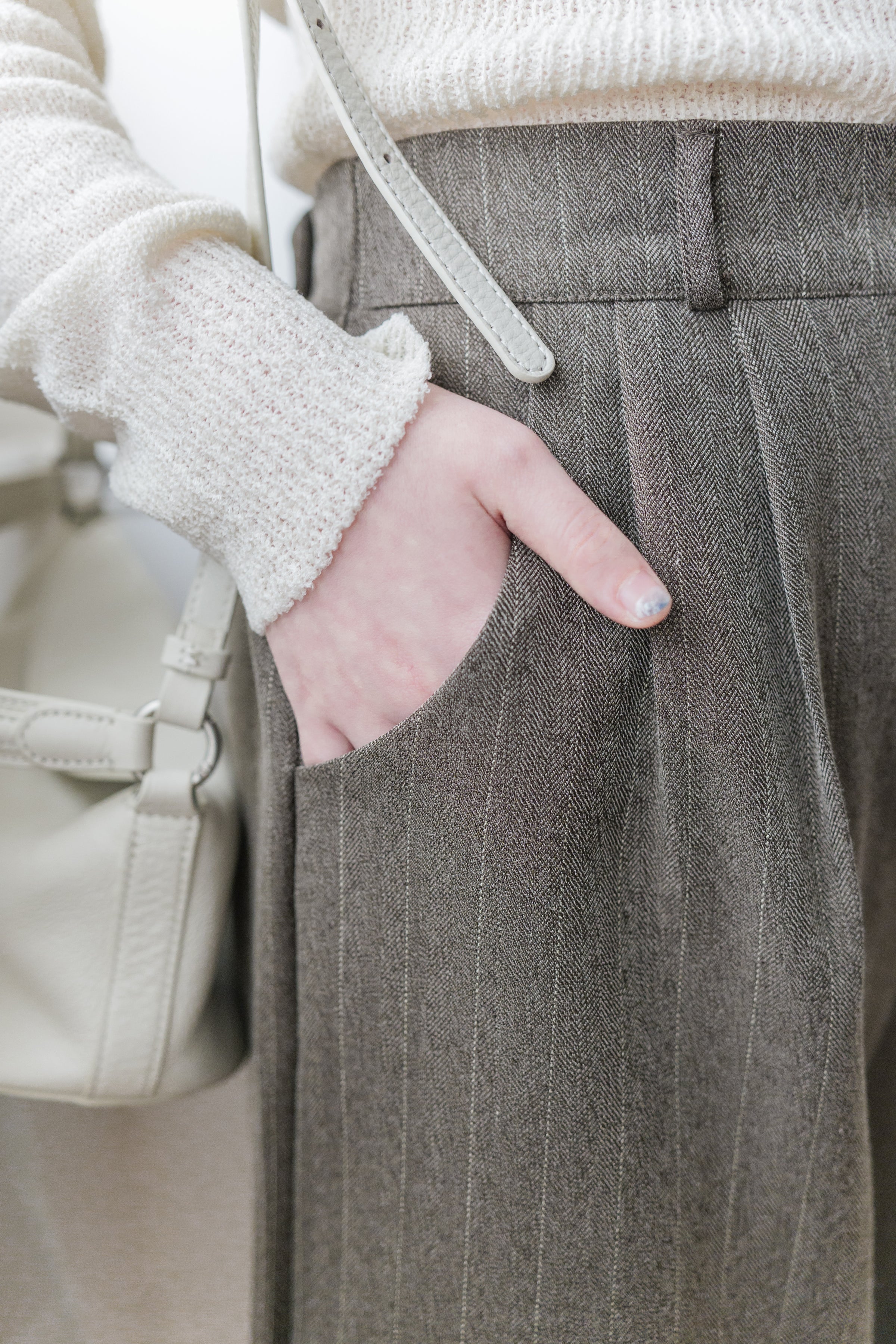 這款褲子巧妙融合經典細條紋與高腰A形版型,