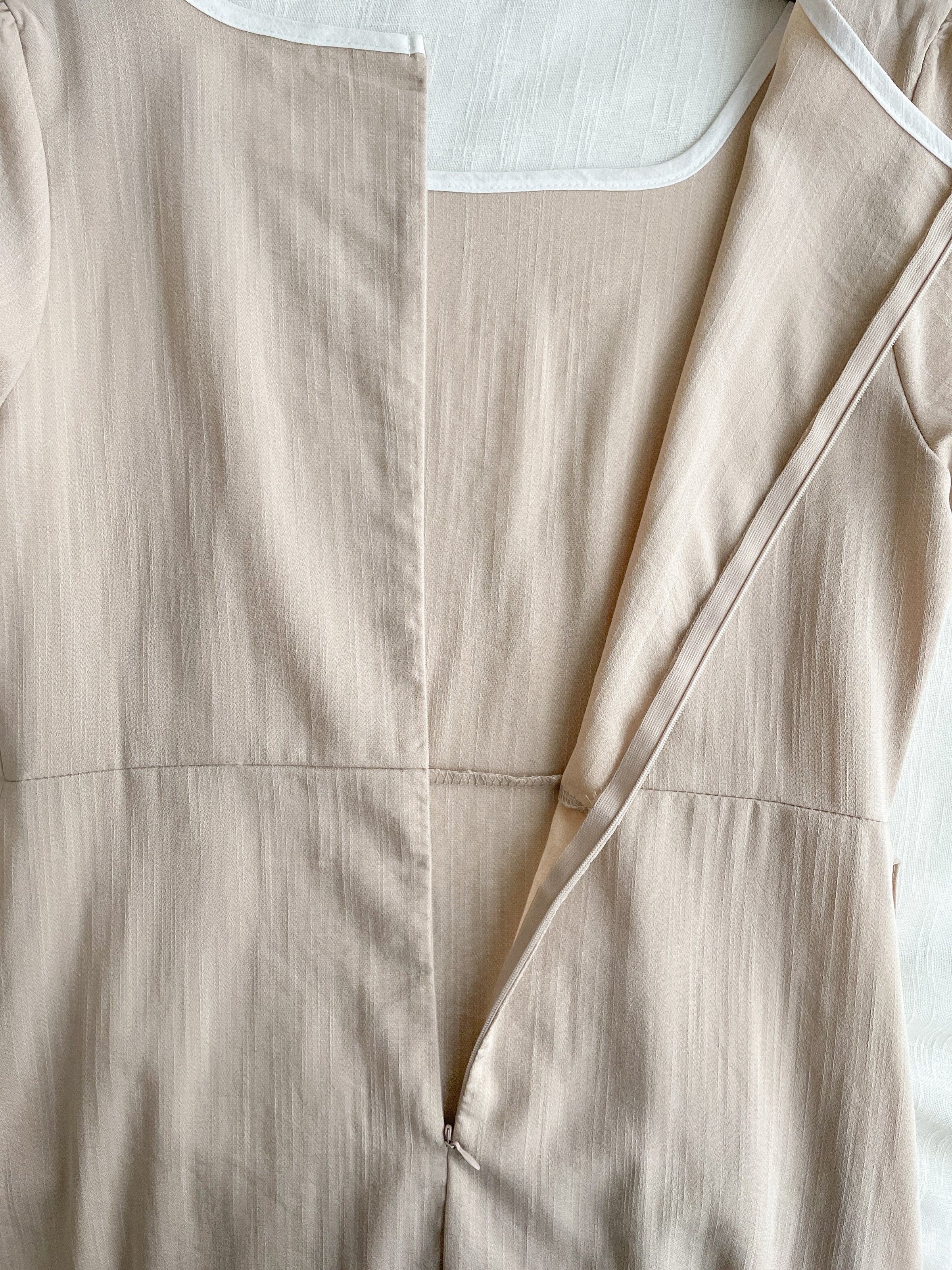 備有:後長拉鍊/ 方領口/ 拼色/ 腰帶修腰