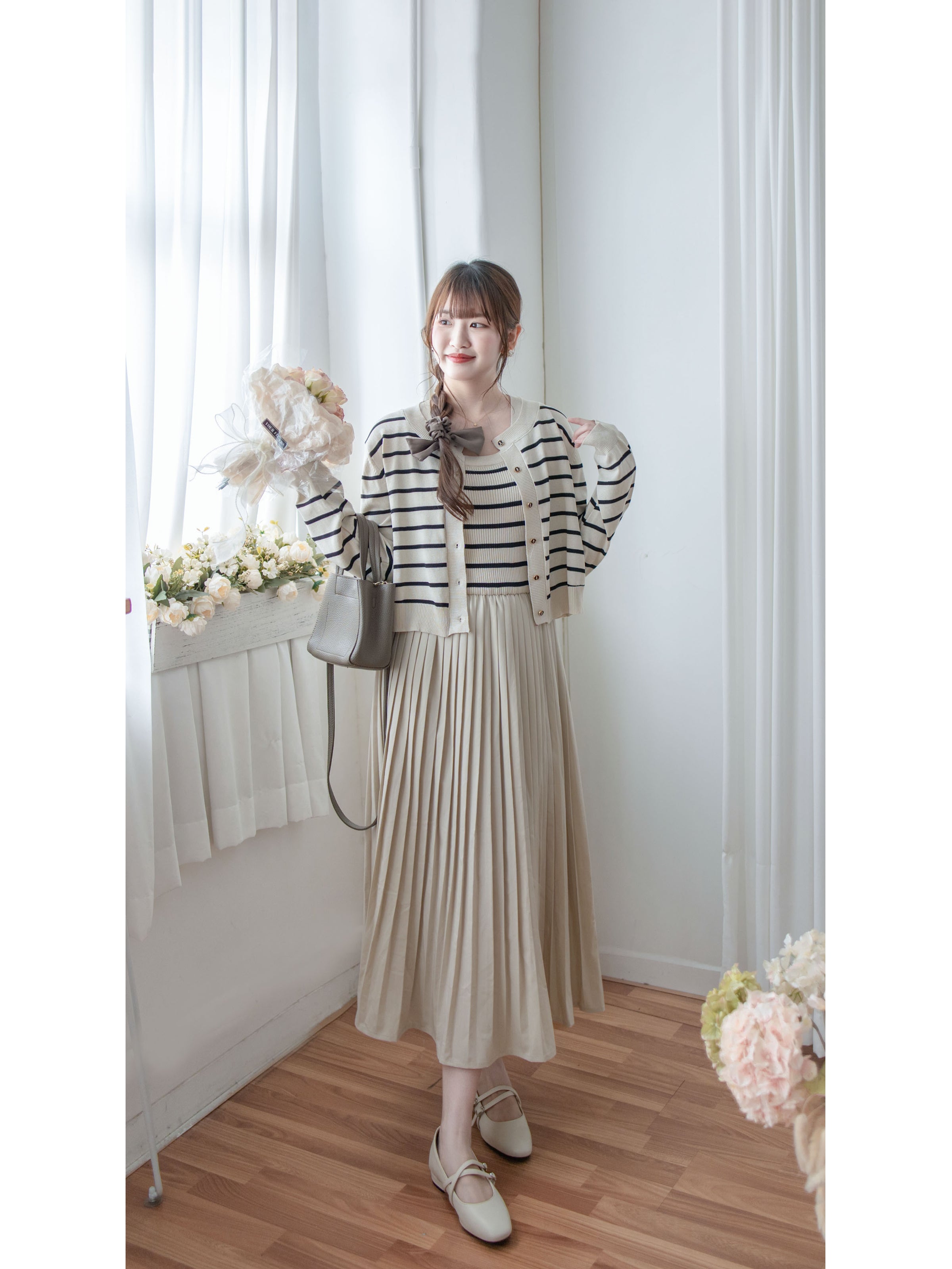 Stripe Dress Set 法式舒適防毛彈性線料外套及百褶連身裙/ SE8092 (pre-order)